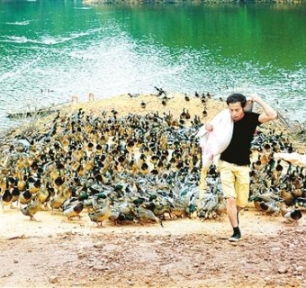 莫富达正在给鸭子添食加料。本报记者唐正芳通讯员施小红文/图8月18日,桂平市麻垌镇联堡村蒙村屯山青水秀的六陈水库,一群群毛色鲜艳的鸭子悠闲地追逐戏水。随着莫富达的声声口哨,鸭子纷纷上岸,扑腾着翅膀从山坳的一头盘旋飞向空中,像翱翔天际的天鹅。去年6月底