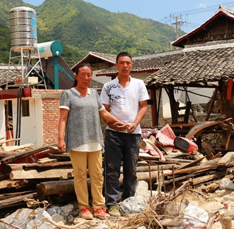 ”文县金坪村村民李加朋, 27岁,皮肤黝黑,在清理自家已经成为废墟的房屋。
