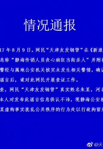 原标题:网民发布谣言视频被拘!天津网警提示:网络不是法外之地,在网上制造、传播信息时若是触碰了法律,公安机关绝不手软。希望广大网民不造谣、不信谣、不传谣,发现谣言及时举报,共同维护健康的网络环境和良好