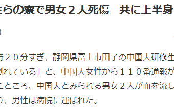 新闻截图 原标题:两名中国研修生在日遇袭 宿舍内被砍1死1伤 海外网8月22日电 21日20时20分过后,日本静冈县富山市田子的两名中国研修生在一间宿舍中疑似被砍伤,男性倒在血泊之中,女性则拨打了报警电话。县警赶来时,发现现场男女两人均倒在血泊中,女性已