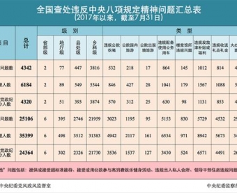 人民网北京8月21日电为掌握全国贯彻落实中央八项规定精神情况,中央纪委在31个省区市和新疆生产建设兵团、139个中央和国家机关、102个中央企业、15个中央金融企业建立了落实中央八项规定精神情况月报制度。2017年以来,截至7月31日,全国查处违反中央八项规定精
