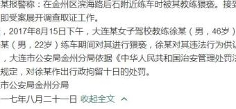中新网8月21日电 据辽宁省大连市公安局金州分局微博消息,2017年8月16日20时许,金州公安分局后石边防派出所接到李某报警称:在金州区滨海路后石附近练车时被其教练猥亵。接到报警后,警方立即受案展开调查取证工作。
