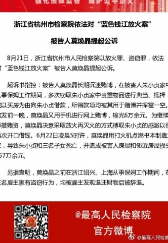 原标题:浙江省杭州市检察院依法对“蓝色钱江放火案”被告人莫焕晶提起公诉