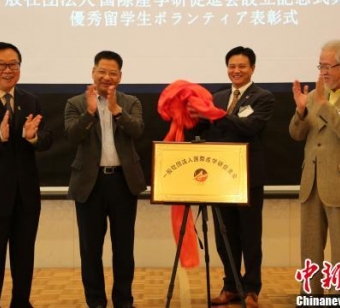 图为日本国际产学研促进会成立仪式。尹法根摄中新网福冈8月20日电(记者尹法根)日本国际产学研促进会成立暨九州地区中国留学生优秀志愿者表彰大会19日在中国驻福冈总领事馆举行。中国驻福冈总领事何振良、国家食品药品监督管理局原副局长边振甲、日本经济产业