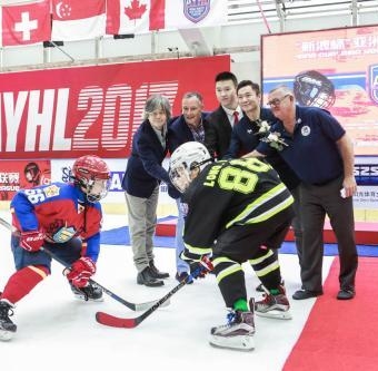 开幕式开球仪式主办方供图中新网北京8月19日电(岳川)2017"新浪杯"亚洲青少年冰球联赛总决赛开幕式18日在京举行。据悉本次赛事历时10天,共吸引逾70支球队、超1500名小球员参与争夺。在经历了长达6个月的分区淘汰赛之后,2017"新浪杯"亚洲青少年冰球联赛正进入总