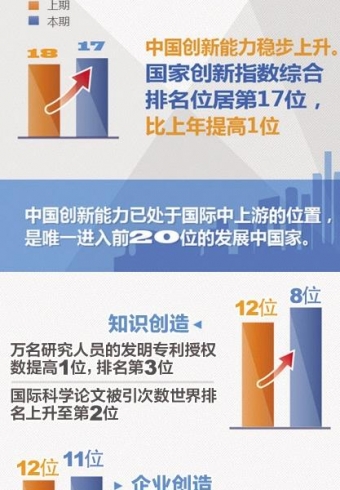 中国科学技术发展战略研究院18日在京发布《国家创新指数报告2016-2017》显示:世界创新格局基本稳定,中国国家创新指数排名超越比利时,提升至第17位,处于第二集团领先位置,是唯一排名进入前20位的发展中国家。