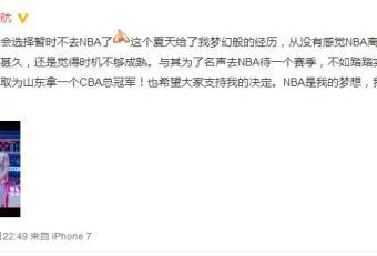 丁彦雨航通过个人微博宣布暂时不登陆NBA。图源丁彦雨航微博中新网北京8月17日电(王禹)昨晚,山东男篮核心丁彦雨航通过个人微博宣布下赛季将不会登陆NBA。在经历了四个月的美国之旅后,他表示时机仍未成熟。新赛季丁彦雨航将继续带领山东男篮,向CBA总冠军发起冲