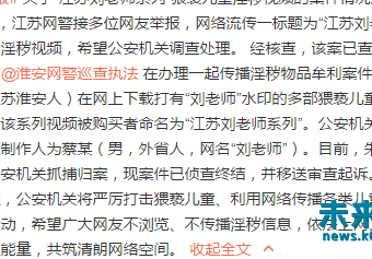 未来网(www.k618.cn)北京8月16日电(记者 刘璐) 今天江苏网警发布了最新关于“江苏刘老师系列”猥亵儿童淫秽视频的案件情况通报。通报中表示,公安机关进一步侦查发现,涉案人员蔡某、朱某某等人均已被公安机关抓捕归案,现案件已侦查终结,并移送审查起诉。