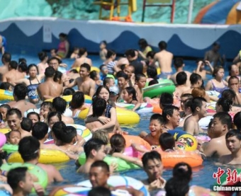 8月15日,洋人街一水上乐园吸引不少民众玩水纳凉。当日,重庆"秋老虎"开始发威,室外最高气温已逼近40℃。陈超 摄