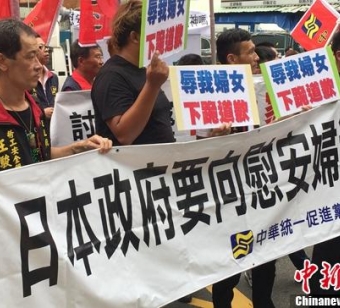 中新社台北8月15日电(记者路梅李欣)台湾中华统一促进党15日下午在台北集会,要求日本政府正视历史,向当年被迫做"慰安妇"的受害女性道歉。8月15日下午,台湾中华统一促进党在位于台北的"日本台湾交流协会"门前集会,要求日本政府正视历史,向当年被迫做"慰安妇"的