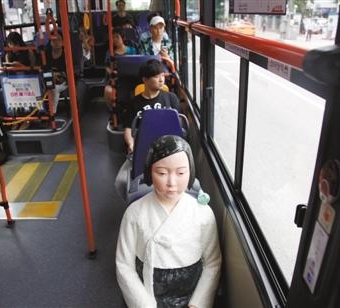 8月14日,在韩国首尔,人们乘坐载有"慰安妇"少女像的151路公交车。新华社记者姚琪琳摄8月14日是第五个世界"慰安妇"纪念日,这是韩国、中国、日本等国民间团体一同确立的纪念日。当天,韩国各地举办了各种纪念活动,敦促日本政府真诚道歉,也希望民众牢记历史,关注已