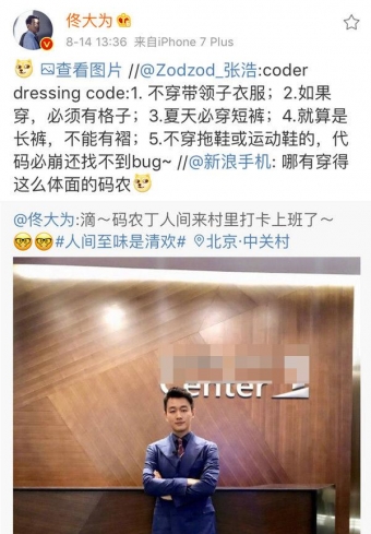 8月14日一大早,佟大为现身中关村某互联网公司,参加某电视节目的外景录制。随后,佟大为在微博晒出自己参观体验的照片,并用新剧《人间至味是清欢》中的角色身份幽默配文称:"滴~码农丁人间来村里打卡上班了。"照片中,佟大为身穿蓝色西服套装,帅气有型。还有网友