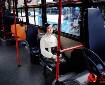 首尔市公交车内的"慰安妇"少女像。夏雪摄人民网首尔8月14日电(夏雪)8月14日上午,韩国首尔市151路公交车迎来了特殊的乘客——一位身着韩服、赤脚短发的"少女"。她紧握着双拳,神情忧郁而黯淡。8月14日是世界"慰安妇"纪念日,为了让人们铭记"慰安妇"受害者曾经遭