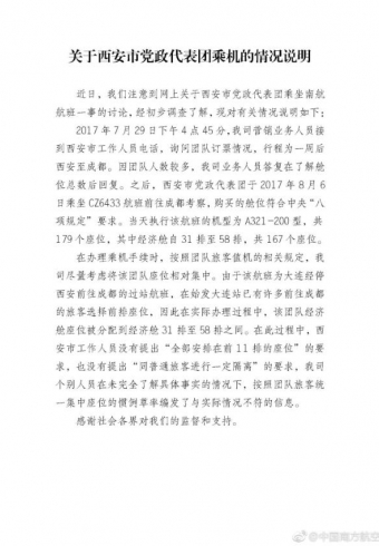 中新网8月12日电近日,有报道称南航西安分公司为66名政府政务团安排前11排的座位,而且同普通旅客进行一定隔离。中国南方航空今日在微博发表情况说明,称是个别人员在未完全了解具体事实的情况下,按照团队旅客统一集中座位的惯例,草率编发了与实际情况不符的信息
