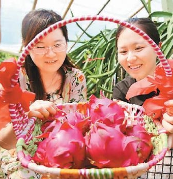 山东省东营市东营区推行"生态农业+全域旅游+产业脱贫"的模式,推动当地农民在生态旅游中实现精准脱贫。图为8月11日东营区南二路北侧耿井村富硒火龙果采摘基地,市民采摘成熟的火龙果。