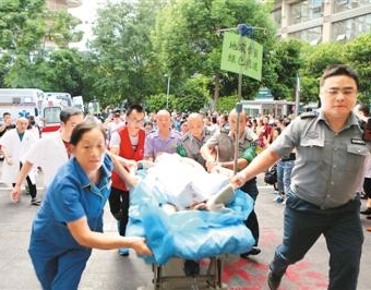 8月9日,4名九寨沟地震中骨折的重症患者在交警开道护送下被送到绵阳市中心医院急诊科。陈冬冬摄(人民视觉)8月8日21时19分,四川省阿坝州九寨沟县发生7.0级地震,造成人员伤亡。8月9日7时27分,新疆博尔塔拉蒙古自治州精河县发生6.6级地震,有人员受伤。生命为号,灾