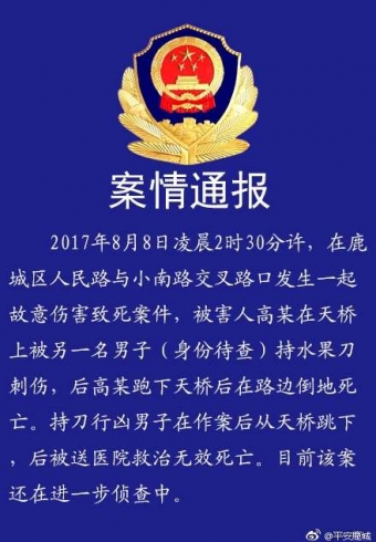 原标题:温州一90后男子遭割喉 行凶者随后跳天桥身亡法制晚报·看法新闻(记者朱健勇)8月8日凌晨2时30分许,温州鹿城发生一起命案,一90后男子遭割喉。刚刚,温州鹿城公安局官方微博通报了