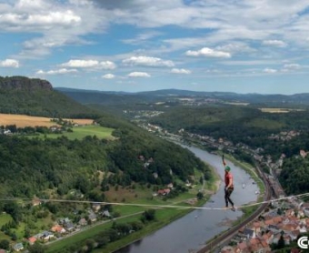 2017年8月5日讯(具体拍摄时间不详),德国柯尼希施泰因,户外运动节期间,冒险者们挑战在易北河之上走高空绳索。2017年8月5日讯(具体拍摄时间不详),德国柯尼希施泰因,户外运动节期间,冒险者们挑战在易北河之上走高空绳索。