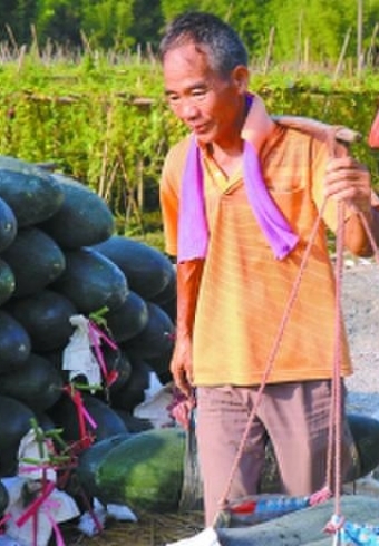 村民介绍说,现在请人挑瓜,每斤6分,由于天气炎热,一般一人一天能挑3吨多的冬瓜,大约一人能挣到400元左右。”村民陈伯说,自己年逾五旬,在挑瓜工里算是壮丁,挑夫队伍里最年长的近60岁。