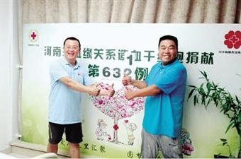 李宏广(左)和许志刚(右)合影留念本报讯昨天上午,来自焦作、周口、郑州的李宏广、许志刚、程福宾分别在省肿瘤医院和省人民医院同时捐献造血干细胞,挽救在郑州、上海和四川住院治疗的血液病患者生命,他们成为全省第631、632、633位捐献者。