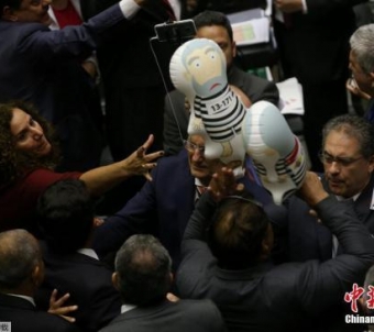 中新社圣保罗8月2日电(记者莫成雄)当地时间8月2日晚,巴西国会众议院全会以264票支持、227票反对、2票弃权的投票结果,决定不将现总统特梅尔受贿案提交至联邦最高法院审理,特梅尔继续履行总统职责。当地时间2017年8月2日,巴西巴西利亚,巴西总统特梅尔因涉嫌受贿