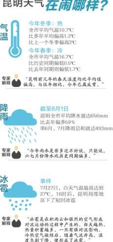 "今年的天气太反常了。"这两天,昆明人打招呼也像老外一样谈起了天气。的确,从过完年的"暖冬",到三四月持续低温的"假春天",再到"7·20"暴雨洪涝,总让人有反常之感。特别是近期,好不容易有了点夏天的样子,明明白天温度快到30℃,傍晚竟然下起了冰雹。那么,昆明今