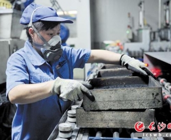 ←卸钵工王满香戴上特制的手套,等烧结钵自然冷却10分钟后,快速托起烧结钵,将材料倒入专用的塑料桶。均为长沙晚报记者王志伟、通讯员唐炎琰摄影报道↑混料班班长陈乐头上挂满汗珠,工作服也已湿透。长沙晚报记者伍玲外面太阳暴晒,热浪狂袭,在遮阳的室内工作,总