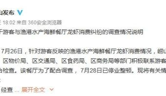 中新网7月31日电山东青岛崂山区人民政府新闻办官方微博今日晚间发布《关于游客与渔港水产海鲜餐厅龙虾消费纠纷的调查情况说明》。情况说明指出,针对游客反映的渔港水产海鲜餐厅龙虾消费情况,经查,该餐厅采用标价签与价目表方式标价,符合明码标价规定。7月26日