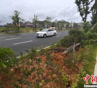 7月30日,福清市街头一些行道树被台风吹倒。张斌摄中新网福州7月30日电(闫旭)7月30日清晨6时前后,今年第9号台风"纳沙"穿过平潭岛,在福建省福清市沿海登陆,登陆时中心附近最大风力12级(33米/秒,台风级),中心最低气压975百帕。30日上午,中新网记者顶风冒雨来到福