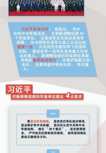4月18日,中共中央总书记、国家主席、中央军委主席习近平接见新调整组建军级单位主官,并对各单位发布训令