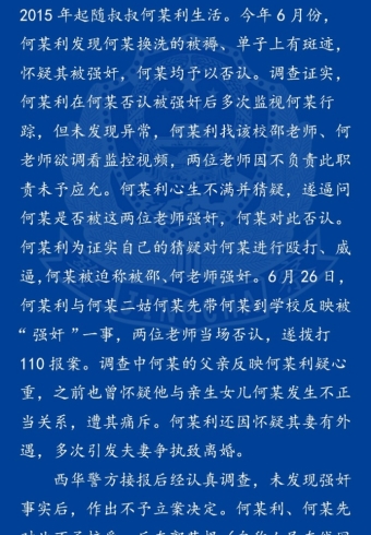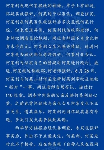 7月5日,周口市公安局组成专案组,在检察机关监督下对网传的“西华奉母一中何某被强奸案”进行全面细致核查。经核查:未发现何某被强奸的事实及证据,维持西华县公安局作出的不予立案决定