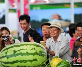 7月27日,参观民众在展会上拍摄127斤重的大西瓜。当日,第十届辽宁国际农业博览会暨第十七届中国沈阳国际农业博览会在沈阳国际展览中心举行。中新社记者 于海洋 摄