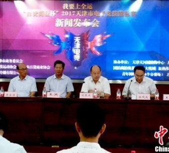 图为新闻发布会现场。张道正摄中新网天津7月27日电(记者张道正)记者27日从"我要上全运·百货商业杯2017天津电子竞技锦标赛"新闻发布会上获悉,天津全运会再度实现创新举措,将举办"电子竞技锦标赛",促进商业与体育结合。2017年8月,中华人民共和国第十三届运动会