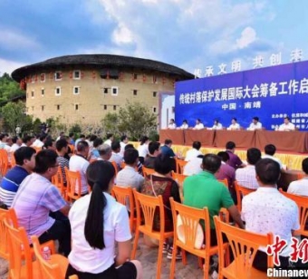 7月25日,首届"传统村落保护发展国际大会"筹备工作启动仪式在福建(南靖)土楼景区怀远楼前召开。陈瑞章摄中新网南靖7月25日电(陈瑞章)首届"传统村落保护发展国际大会"筹备工作25日在福建(南靖)土楼景区怀远楼前启动。启动仪式上,住建部总经济师赵晖宣布传统村落