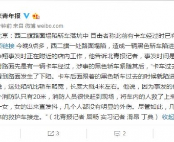【北京:西二旗路面塌陷轿车落坑中 目击者称此前有卡车经过时已有塌陷】今晚9点多,西二旗一处路面塌陷,造成一辆黑色轿车陷进坑中。目击者余翔事发时正在附近的店内工作,他告诉北青报记者,事发时间是9点半左右