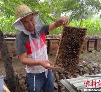 图为李家的蜂场里,蜂农在蜂箱之间进行照料。韩章云摄中新网林州7月25日电(韩章云)7月底,太行山里的养蜂人李虎云进入了一年最忙碌的季节,采蜜期已过,他要保证自己所养的300多群蜜蜂在辛苦了一整个春夏后,为越冬做好充足准备。作为家里的第三代养蜂人,李虎云家