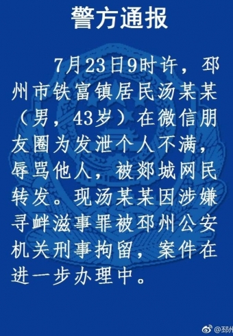 男子朋友圈辱骂他人被郯城网民转发 邳州公安将其刑拘
