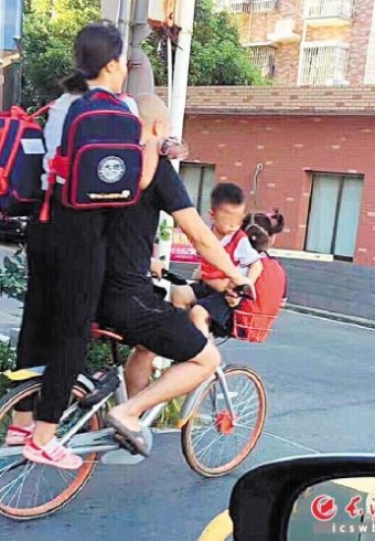 长沙晚报讯(记者邓艳红实习生周思佳)据长沙网友"superlu"爆料,昨日早上在望岳路附近上班路上,看到惊险一幕:四个人挤在一辆摩拜单车上,后面站一个,车把手上坐一个,篮子里居然还装了一个。从网友发布的照片来看,单车后面站着的市民背着两个书包,网友直感叹,这样