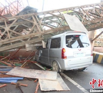高架工地坍塌压住一过路面包车。李斌摄中新网武汉7月18日电(李斌)18日6时9分,武汉市东湖高新区大学园路附近一高架工地发生坍塌,有人员被困。武汉消防指挥中心接警后,迅速调集高新消防中队赶赴现场救援。消防官兵展开救援。李斌摄消防官兵到达现场后了解到,一