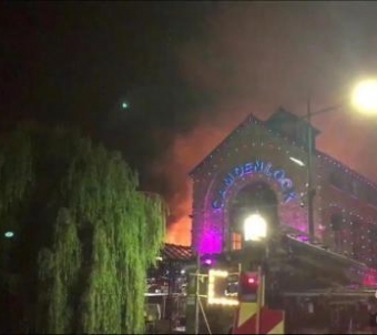 中新网7月10日电据外媒报道,伦敦消防局发布消息称,英国伦敦北部肯顿市集(CamdenMarket)大火已被扑灭,无人受伤。图为火灾现场。火灾发生于7月9日晚,三层楼和大楼房顶着火。10辆消防车和70余名消防员参与灭火。据该消防局在Twitter上称,数个班组继续留在事故现