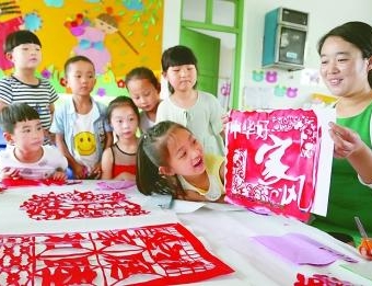 河南宝丰县汇佳幼儿园的小朋友和老师一起创作剪纸作品《中华好家风》。