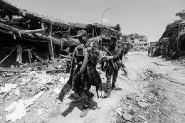 7月9日,在伊拉克摩苏尔老城区,警察搬运"伊斯兰国"武装分子用于自杀式袭击的腰带。新华社发据新华社电伊拉克总理兼武装力量总司令海德尔·阿巴迪9日宣布,政府军在摩苏尔战役中取得胜利。去年10月,伊拉克政府军发起收复摩苏尔的军事行动。按英国《卫报》的说法,