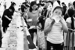7月9日,太原长风街某商场内,6位厨师用肉、火腿、西红柿等各种馅料,历经1小时制作而成的一条30米长的巨型三明治,吸引了众多食客免费前来品尝。