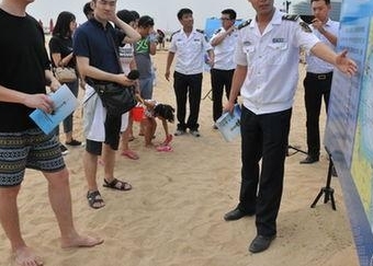 新华网天津7月9日电(周润健、李程) “航标,相当于海上的‘红绿灯’,航标灯的正常工作,是对船员生命的守护……”循着声音,9日上午,记者在天津滨海新区东疆湾沙滩公园内看到一批身着海事制服的年轻人,正在向往来市民热心讲解着航标知识。