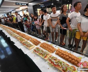 7月9日,山西太原北美N1,由6名厨师历经1个小时制作而出的30米巨型三明治在此亮相,吸引了500余名食客前来排队免费品尝美味。 韦亮 摄