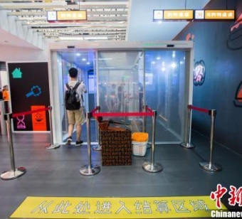 图为造物节现场零售店"淘咖啡"自动支付现场。供图中新网杭州7月8日电(赵小燕)一个不用掏钱包、不用掏手机的也能买单的零售店"淘咖啡"8日在2017淘宝造物节上开门迎客。在这个店铺,顾客扫码通过闸机后,可以像平时购物那样,随意在店内选货。离店前,顾客会经过一