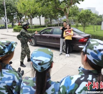 上海高校军训首次新增反劫持演练。图为6日现场武警教官为参训学生演示反劫持要领。王知洲摄中新网上海7月6日电(陆振鑫黄健)"人质在我手上,你们别过来,反正我们也不想活了。6日,在上海济光职业技术学院体育馆旁,两名蒙面男子挟持了一名在校女生,并扬言准备同归