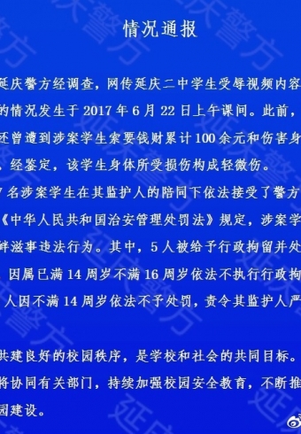 延庆警方通报“中学生被逼吃粪便”事件:5人拘留罚款,2人不予处罚。