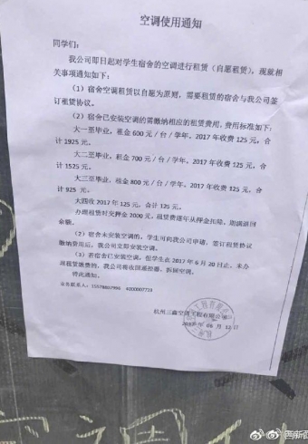 【南宁一高校统一安装空调 租赁价因人而异被吐槽】对于空调的使用,有的高校把费用算进了住宿费,有的则采用租赁的形式。这几天,广西财经学院相思湖校区的同学们就面临租空调的问题。让同学们心里不舒服的是,同款空调的租赁费标准竟然有着年级之分。大一是6
