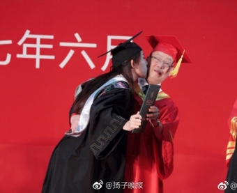 6 月22 日,一组大学女生在毕业典礼上“亲”校长的照片走红网络。照片中,南京农业大学2017届毕业生闻若雪在颁发学位的典礼上,当众亲吻该校校长周光宏脸颊,校长避之不及的表情让网友纷纷大呼可爱。